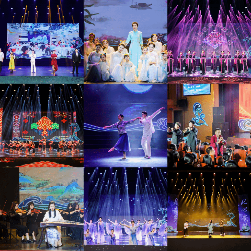 晚会在震撼人心的开场视频与展现大海壮阔之美与力量之美的舞蹈《大海的邀请》中拉开帷幕。吹打乐《庆胜利》以激昂的旋律奏响了胜利的凯歌,点燃全场;情景剧《此心安处是吾乡》为观众描绘出一幅幅温馨动人的校园画卷,沉浸式体验那段青涩而又美好的校园岁月;器乐合奏《云裳诉》的乐声如流水般缠绵悱恻,将观众带入一个宁静而美好的世界;情景歌舞《旗韵芳华》将华服之美与艺术相结合,展现出海大学子的青春活力与风采;表演唱《苗歌请来幸福水》用歌声深情表达了对幸福生活的热切向往和不懈追求,展现了苗族文化的独特魅力与深厚底蕴;《海上声民乐》将观众带入了一个浩瀚无垠的音乐世界,多种民族乐器共同奏响,演绎着生命的激情与力量;表演唱《相亲相爱一家人》、舞蹈《祈愿》、情景歌舞《以你为荣》等节目以优美的舞姿和深情的歌声,表现了对母校的深情厚意与真挚祝福……