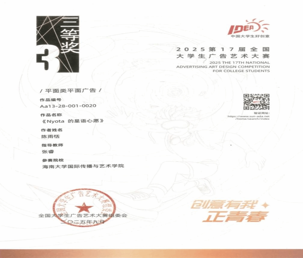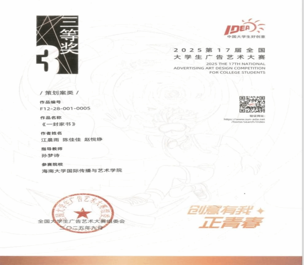 2025年12月6日至7日,第17届全国大学生广告艺术大赛学科竞赛成果展示盛典暨全国大学生广告艺术大赛华彩20周年颁奖典礼在北京政协礼堂隆重举行。本届大赛吸引全国176万名学子参与,收到创意作品58万余组,黄色网站