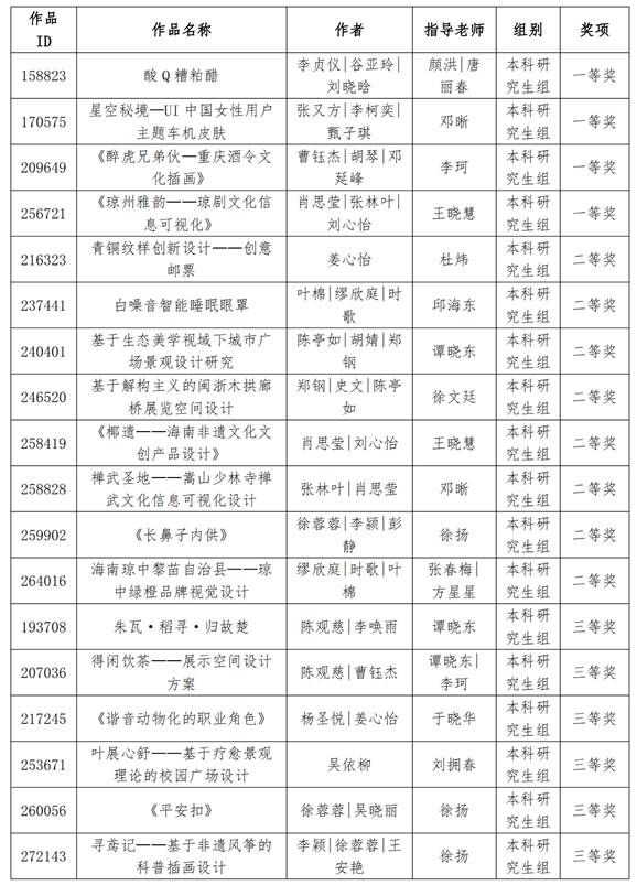 在设计教育领域的学科实力与对创新教学实践的不懈追求。持续创新教学方法和手段,为学生提供更优质的设计教育,同时也有利于激发学生的学习热情和创新潜能,鼓励其积极参与到各种设计实践活动中,不断提升设计能力和综合素质,为海南自由贸易港的文化建设和设计事业添砖加瓦,用专业才能在设计领域绽放光彩。